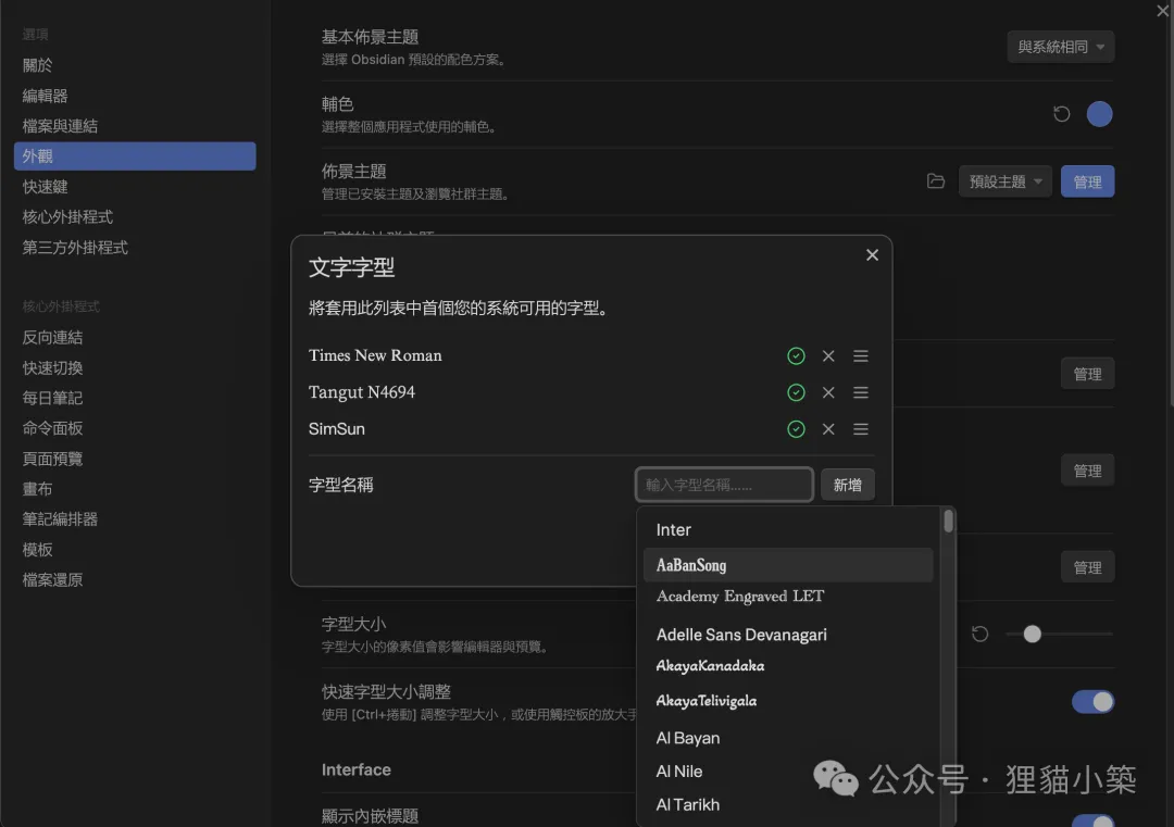 使用Obsidian的第一步是設置字體,路徑為:設置-外觀-文字字型,對於筆者來說:Times New Roman、Tangut N4694、Sim Sun(宋體,Simplified Sung)就可以滿足西夏文錄文、發音構擬、語法標註、翻譯的基本功能。需要注意此處的文字字型優先級,要按照筆者的順序來:因為SimSun、Tangut N4694均含有拉丁字母的字型。Obsidian會按序使用列表中字體來展示文檔的內容。因此如果Times New Roman的順序排在Tangut N4694、SimSun之後的話,在顯示英文內容時,會使用後二者中第二優先的Tangut N4694來渲染。如果希望使用Times New Roman或者其它英文字體展示英文內容,就要把英文字體的優先級提高到漢字字體之前。
